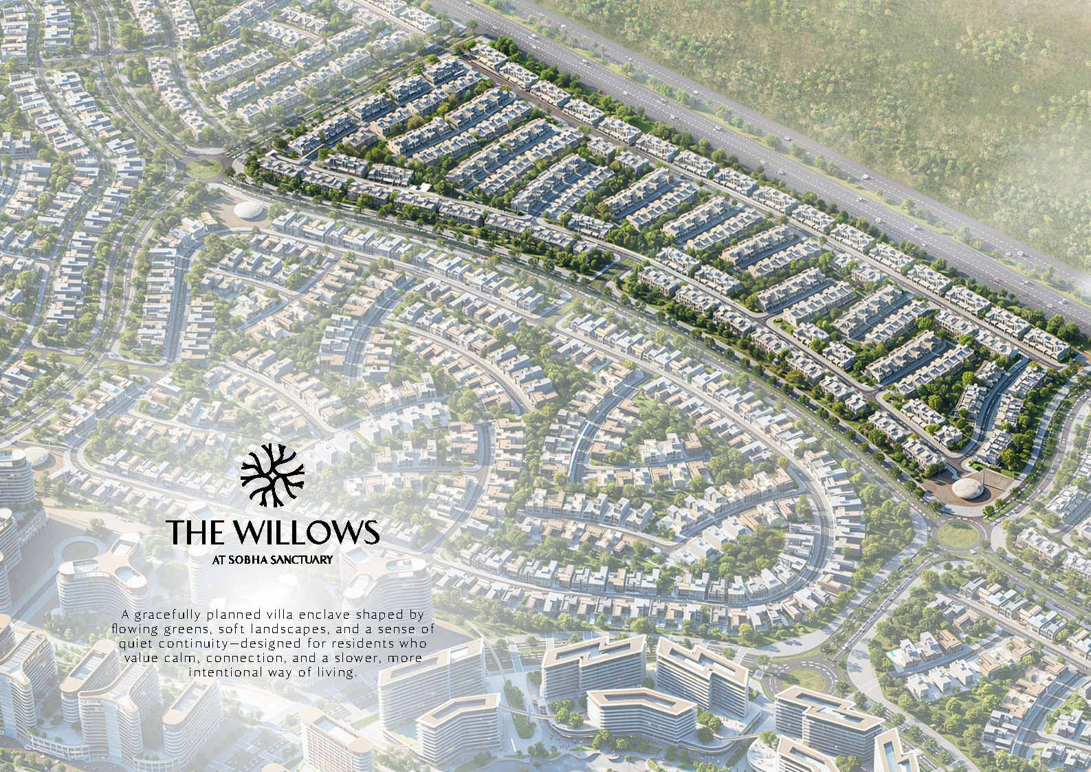 Sobha Sanctuary – The Willows is a serene villa enclave where nature, wellness and community shape everyday life. Set within Sobha Sanctuary’s expansive masterplan — nearly 50% open green space and an ~800,000 sq. ft. park — The Willows places garden villas amid forested jogging and cycling loops, meditation lawns, yoga and pilates pavilions, and outdoor fitness zones. Residences are smart-home ready 4-bedroom garden villas with thoughtful indoor wellness spaces: lounges, meditation rooms, fitness studios and co-working areas. The neighbourhood offers family-friendly play zones, botanical gardens, a clubhouse, mosque, pet therapy gardens, and smart mobility hubs.Features